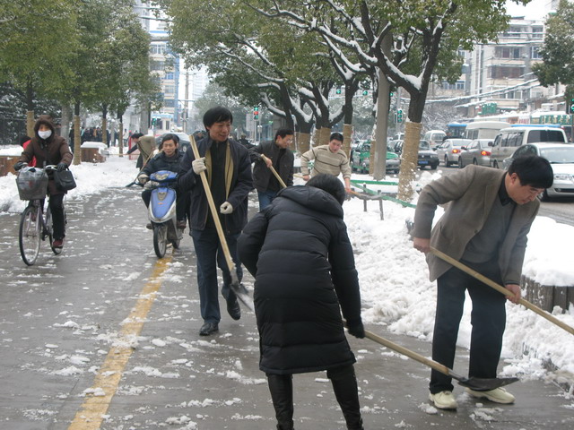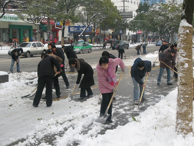公司全體員工不顧天寒地凍,熱火朝天的在街頭揮鍬鏟雪,迅速清除了公司院內、門前及榮事達大道市府廣場至壽春路段交通主干道的路面積雪,保證了公司出入車輛及門前交通干道的行車安全,受到市民的贊許。
