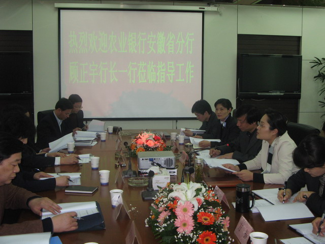 2009年2月12日下午,中國農業銀行安徽省分行顧正宇行長一行來到集團公司調研合肥市基礎設施投融資情況,合肥市副市長李紅親臨現場主持座談會,集團公司董事長李武好、總經理陳軍、副總經理程世琴、方振等參加座談會。