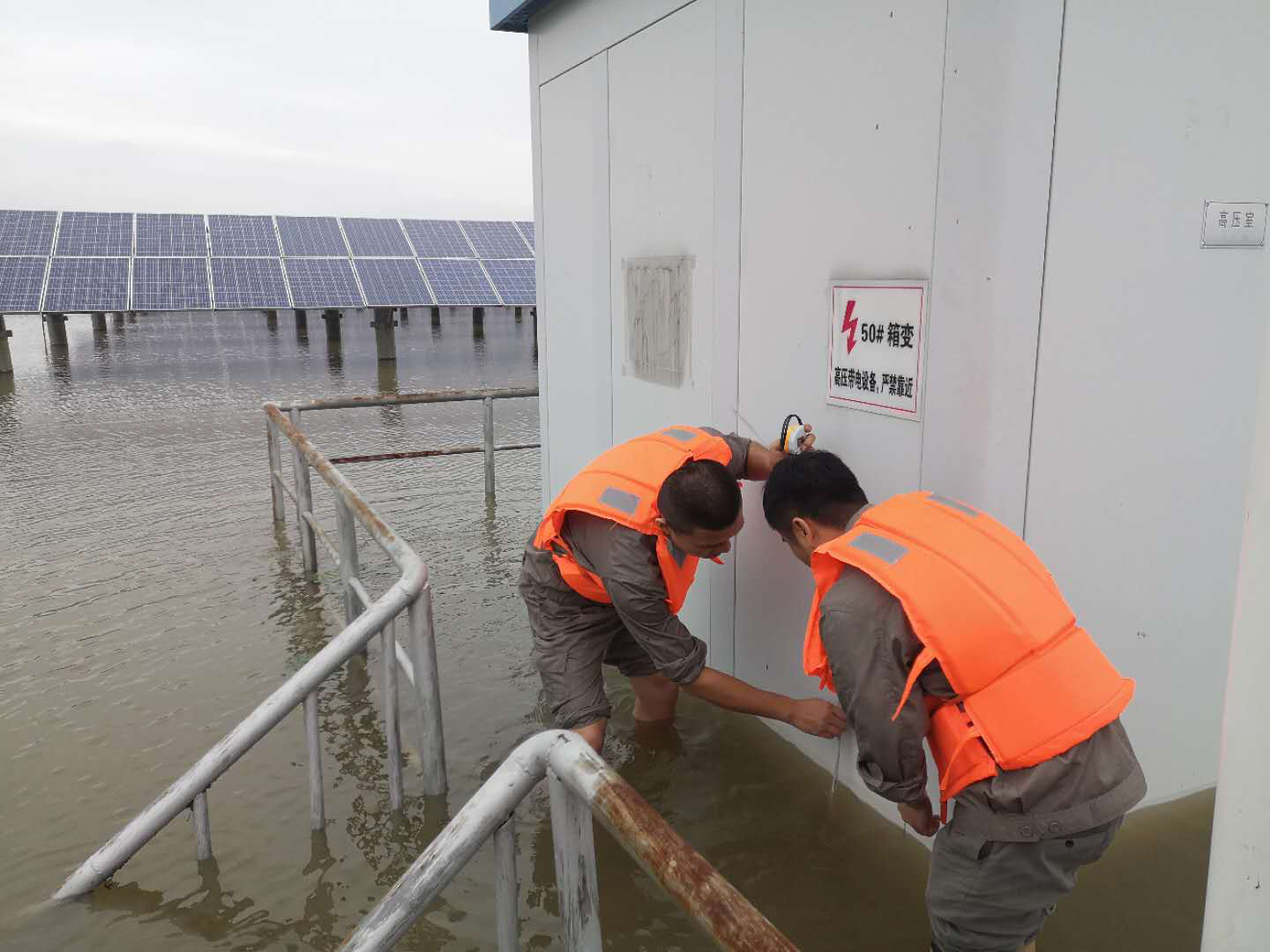 為有效應(yīng)對防汛突發(fā)事件,金太陽公司已在總結(jié)2016年防汛經(jīng)驗基礎(chǔ)上,于2020年4月制定了嚴(yán)謹(jǐn)細(xì)致的光伏電站防汛應(yīng)急救援預(yù)案,并加強(qiáng)排查,提早做好準(zhǔn)備,科學(xué)組織防汛應(yīng)對。按防汛應(yīng)急預(yù)案,抽調(diào)人員24小時值守綜合樓、升壓站、巡視河堤,實時監(jiān)測水文數(shù)據(jù),調(diào)校運行柴油發(fā)電機(jī)、購置大功率水泵等設(shè)備,在室外排水溝及室內(nèi)電纜溝處布置防汛設(shè)備設(shè)施,確保主變壓器等相關(guān)電氣設(shè)備安全;同時配備充足救援物資,全力做好一線防汛抗洪人員安全保障。