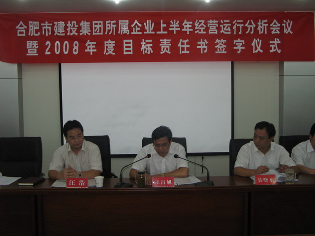 7月23日下午,集團公司所屬企業上半年經營運行分析會議暨2008年度目標責任書簽字儀式在301會議室召開。集團公司領導王昌旭、吳曉東、陸勤航、程世琴,市國資委業績考核處處長汪浩、稽查員許國漢,八家所屬企業全體領導班子成員及集團公司相關部門負責人參加會議。會議由集團公司副總經理吳曉東主持。